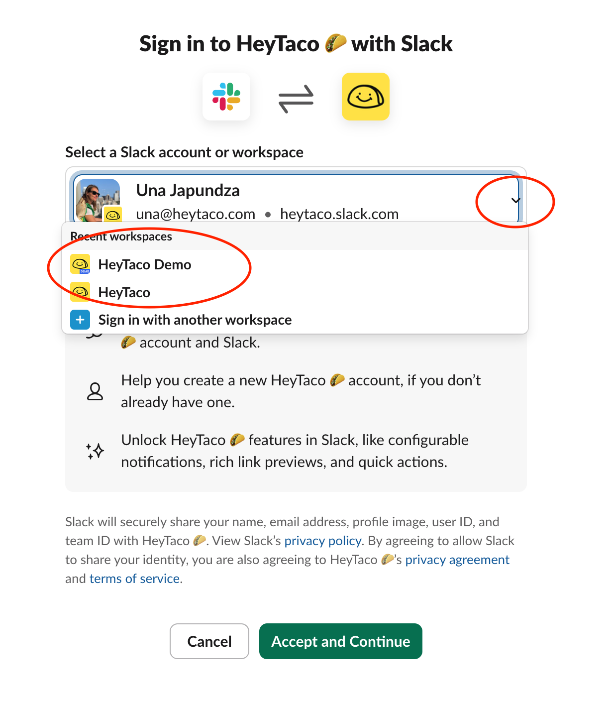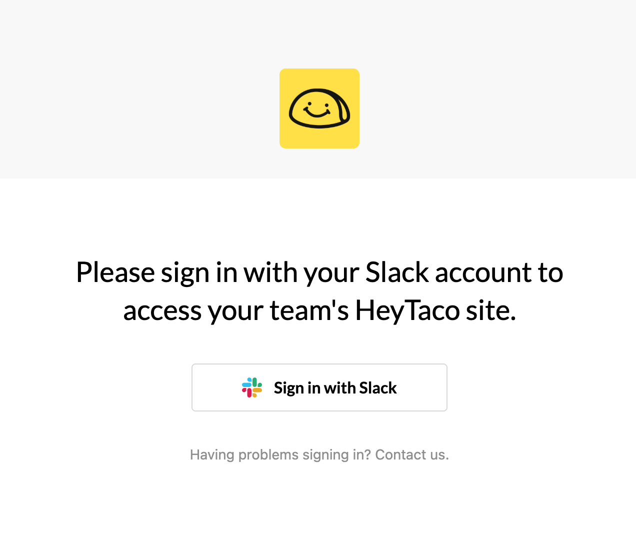 HeyTaco uses Slack SSO to sign you into HeyTaco. No separate usernames or passwords are required beyond your existing Slack credentials. If you are having issues signing into HeyTaco for Slack, please follow the steps below.