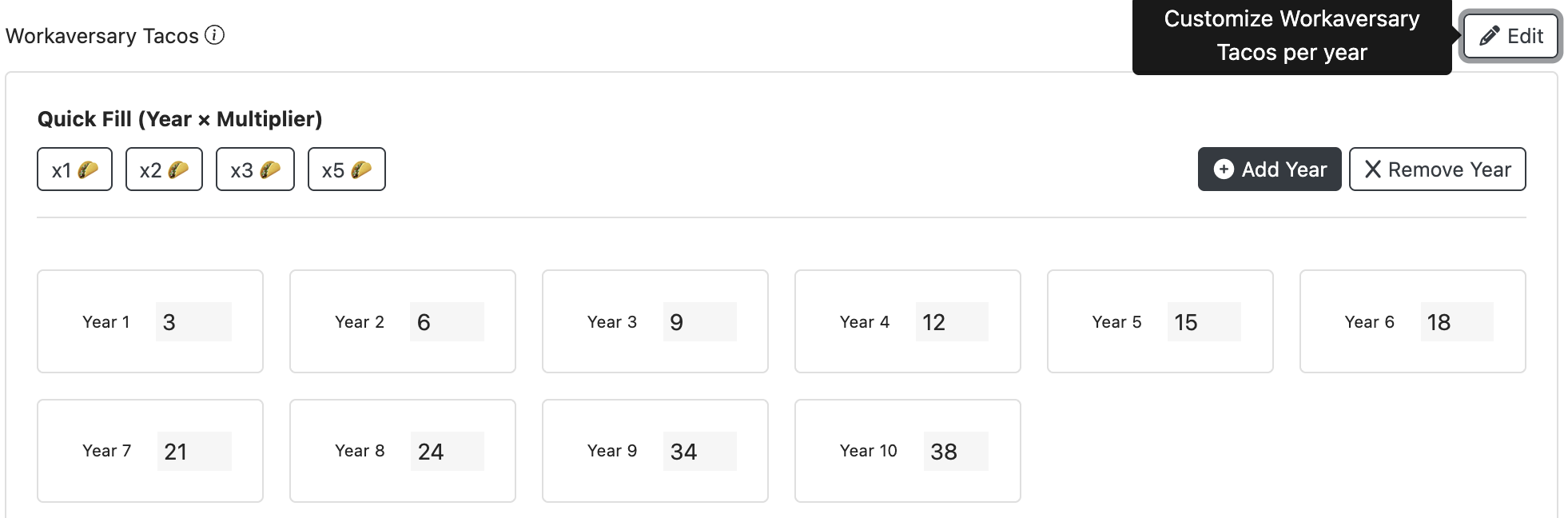 In HeyTaco for Microsoft Teams, you can edit the number of tacos that people receive for their work anniversary.
